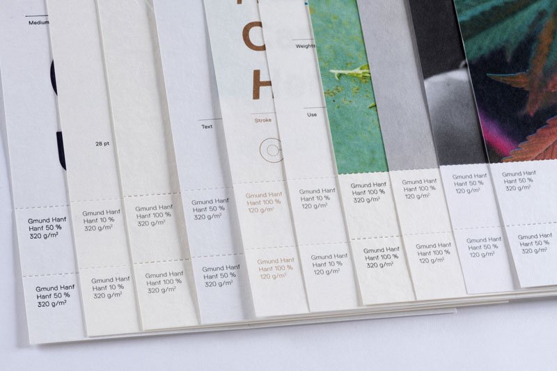 After having developed a hemp paper containing up to 50% cannabis pulp from European cultivation (supplemented by virgin fiber pulp) for its Bio Cycle collection, Gmund Paper has now succeeded in producing a paper made from 100% cannabis pulp. Hemp’s long fibers, which are a challenge for paper production, make this innovative paper both strong in structure and wonderfully soft to the touch. The paper’s surface is wild and cloudy – pure nature. The collection also includes Gmund Hanf 50%, which contains recycled paper fibers, and Gmund Hanf 10%, which is made from pure pulp. Gmund Hanf is produced entirely without dyes.