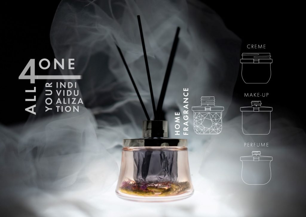 The concept is based on a glass jar in which four interchangeable glass inserts can be used depending on your product application. These inserts can be filled with different contents such as perfume, make-up, cream lotion as well as room fragrances. The advantage is, no matter what configuration, glass refill inserts can be easily exchanged in the outer design glass jar. In addition, the refill inserts are an ideal and lightweight travel companion, they fit comfortably in any handbag for taking with you on excursions and trips. Thus, All4One offers the perfect symbiosis of a high-quality packaging in the private bathroom and portability on the go.